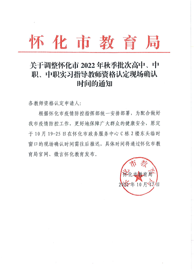 关于调整怀化市2022年秋季批次高中、中职、中职实习指导教师资格认定现场确认时间的通知