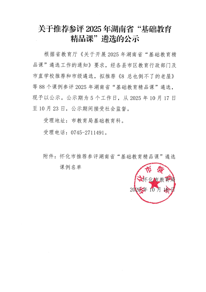 关于推荐参评2025年湖南省“基础教育精品课”遴选的公示